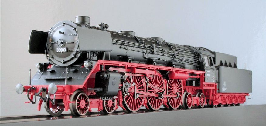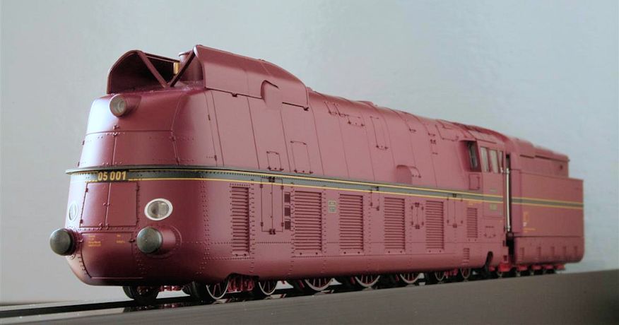 Märklin presentó en el 2004 su modelo para H0 de la carenada 05, como modelo Insider, cód. 37050. Un modelo fabricado enteramente en metal, muy bien reproducido, aún teniendo en cuenta que el carenado integral de la locomotora resta posibilidades a la hora de mostrar detalles. Es una pena que no disponga de la posibilidad de replegar o retirar las persianas laterales, lo que nos permitiría la vista de las grandes ruedas de gran diámetro y el bielaje, que ha sido reducido al mínimo, incluso no se han incluido los cilindros. El color rojo está bien reproducido, aunque como en todos estos modelos, con un aspecto mas mate que el original, que presentaba un acabado brillante. El ténder, que aloja el descodificador el altavoz y el patín, equipa una tapa corredera que desvela la carga de carbón. La máquina monta un motor de campana controlado por un descodificador digital 6090x con sonidos de vapor y silbato, así como la posibilidad de equipar un fumígeno. Las luces son por medio de LED. En resumen, un gran modelo para componer nuestro Expreso Berlín-Hamburgo.