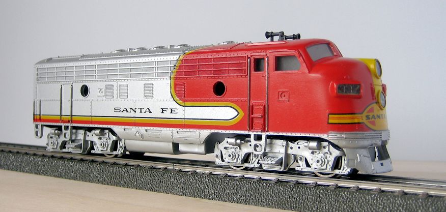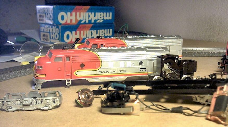 Tengo que admitir que mi afición a los trenes recomenzó allá por 2005 al ver en Canal Historia el sugerente título "Trenes de juguete" (Trains unlimited: Toy Trains). Este documental narra la historia de los trenes Lionel, y en él aparece una F7 escala 0 de esta marca dando vueltas por una maqueta muy americana haciendo sonar la campana en los pasos a nivel. El tren con la Santa Fe de Lionel (que era una F3) fue un auténtico superventas cuando salió en las navidades de 1949, con cientos de miles de cajas vendidas, y siempre me pareció el tren eléctrico por definición. Tanto me gustó aquello que estuve a punto de pedir una caja de iniciación Lionel (con una F7, claro) por Internet a Irlanda, que fue el sitio mas cercano que encontré. De esta locura desistí cuando Antonio Martínez, desde LCTM, me llevó a la senda de la verdad, o sea a Märklin, a una escala mas manejable y a trenes menos de juguete. Así que ya encarrilado en la fe verdadera una de mis primeras locomotoras fue una F7, una 3060 que me pareció preciosa. Ahora esta 3060 (huérfana de su acompañante sin motor, que se perdió por avatares familiares, y que iba a estar en un diorama estático con un ambiente tal como vemos en la película "Bad Day at Black Rock" (aquí es una "Black Widow de Southern Pacific la que aparece), está en situación de "desguace en espera de mejoras técnicas que nunca llegan", a ver si se le pone un descodificador y se arreglan las luces y el interior de la cabina, como se ve en esta foto: