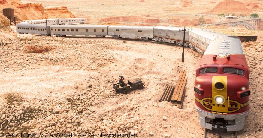 Foto © Märklin.En el anuario de 2014 apareció un espléndido tren con 3 unidades tractoras (A-B-B) y 6 coches "streamliner": Era el "Super Chief" de Atchison, Topeka & Santa Fe Railway (AT & SF). La locomotora y una unidad F7B estaban motorizadas y controladas por un descodificador mfx con sonidos. Las luces, números, la "Mars light" y el interior de la cabina estaban iluminadas con LED "Warm white", así como también lo estaban todos los coches. Un modelo soberbio en edición limitada de 1500 unidades certificadas.