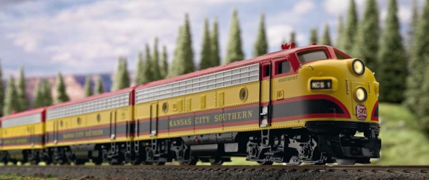 Foto © Märklin.Esta locomotora con 3 unidades A-B-A de la Kansas City Southern, número KCS 1, reproducen el prototipo actual en circulación. Motores en las unidades F7 y sonidos con altavoz en la F7B, controlados por un descodificador mfx. 2000 unidades.