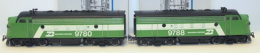 h03067.dk.En 1989 las unidades de Burlington Northern con números 9780 (3181) y 9788 (4181 sin motor) con librea verde manzana.