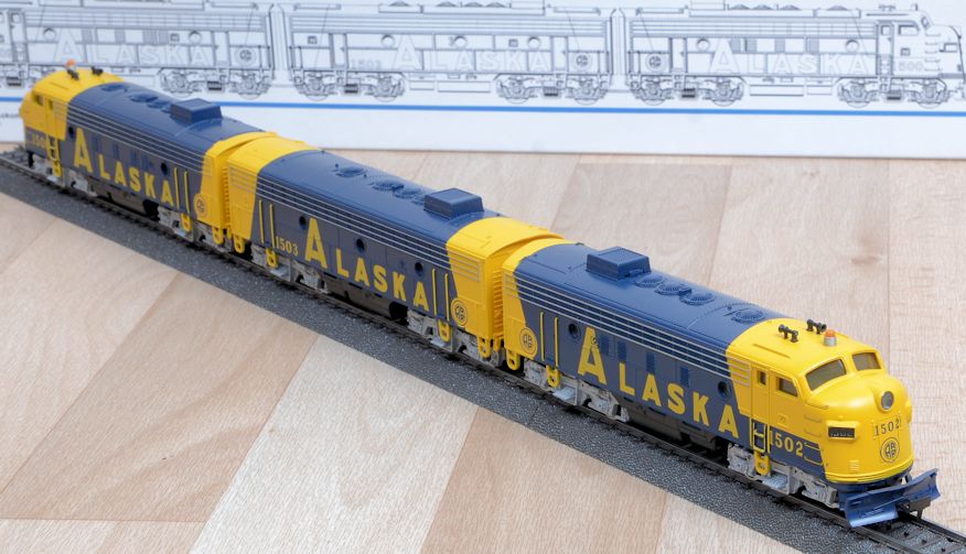 Vendedor eBay dansibar.La locomotora A-B-A Alaska apareció como modelo MHI en 1993. Números 1500/1502/1503, torres de calefacción, luz de advertencia, quitanieves, acople permanente de las 3 unidades.