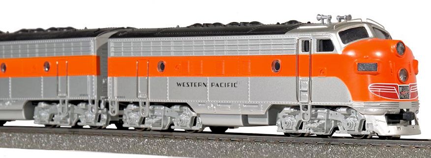 Foto © modellbahn.com.La caja de tren California Zephyr de la Western Pacific de 1999 contenía una locomotora A-B-B con doble motorización y sonidos. Enganches prototípicos en el frontal, las 3 unidades acopladas permanentemente. Librea naranja y plata.
